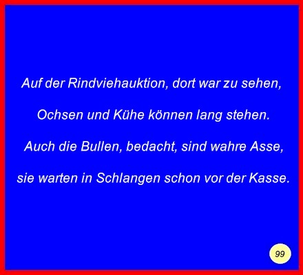 Text Auf der Rindviehauktion, dort war zu sehen,Ochsen und Kühe können lang stehen. Auch die Bullen, bedacht, sind wahre Asse, C 2008 Buchstabe des Tages: M