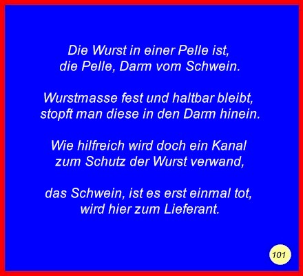 Text Die Wurst in einer Pelle ist,die Pelle, Darm vom Schwein. Wurstmasse fest und haltbar bleibt, Wie hilfreich wird doch ein Kanal das Schwein, ist es erst einmal tot, C 2008 Buchstabe des Tages: n
