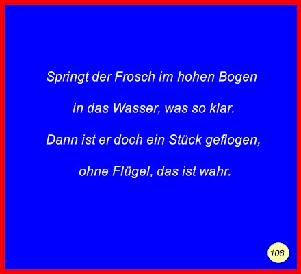 Text Springt der Frosch im hohen Bogenin das Wasser, was so klar. Dann ist er doch ein Stück geflogen, C 2008 Buchstabe des Tages: e