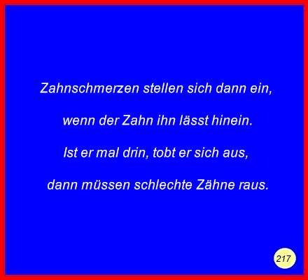 Text Zahnschmerzen stellen sich dann ein,wenn der Zahn ihn lässt hinein. Ist er mal drin, tobt er sich aus, C 2008 Buchstabe des Tages: e