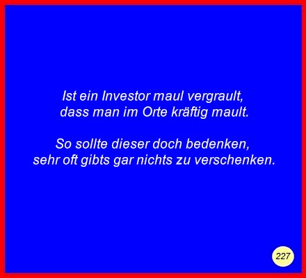 Text Ist ein Investor maul vergrault,dass man im Orte kräftig mault. So sollte dieser doch bedenken, C 2008 Buchstabe des Tages: r