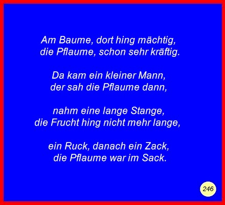 Text Am Baume, dort hing mächtig,die Pflaume, schon sehr kräftig. Da kam ein kleiner Mann, nahm eine lange Stange, ein Ruck, danach ein Zack, C 2008 Buchstabe des Tages: a