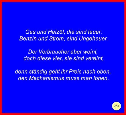 Text Gas und Heizöl, die sind teuer.Benzin und Strom, sind Ungeheuer. Der Verbraucher aber weint, denn ständig geht ihr Preis nach oben, C 2008 Buchstabe des Tages: i