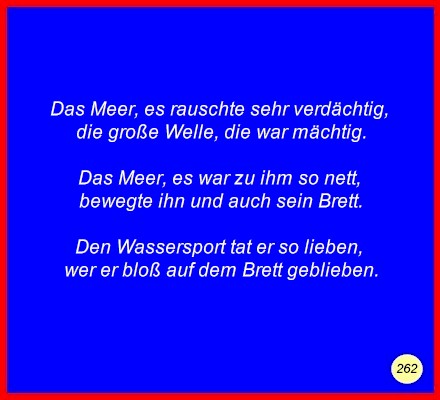 Text Das Meer, es rauschte sehr verdächtig,die große Welle, die war mächtig. Das Meer, es war zu ihm so nett, Den Wassersport tat er so lieben, C 2008 Buchstabe des Tages: f