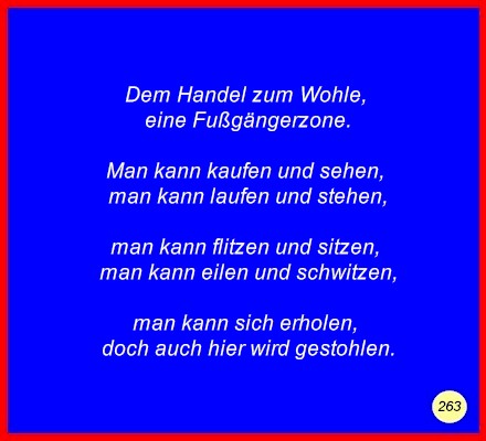 Text Dem Handel zum Wohle, eine Fußgängerzone.Man kann kaufen und sehen, man kann flitzen und sitzen, man kann sich erholen, C 2008 Buchstabe des Tages: r