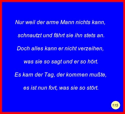 Text Nur weil der arme Mann nichts kann,schnauzt und fährt sie ihn stets an. Doch alles kann er nicht verzeihen, Es kam der Tag, der kommen mußte, C 2008 Buchstabe des Tages: n