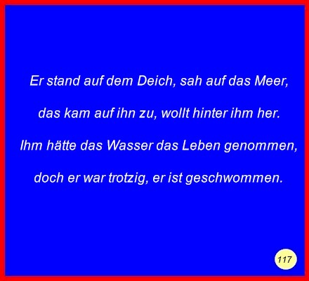 Text Er stand auf dem Deich, sah auf das Meer,das kam auf ihn zu, wollt hinter ihm her. Ihm hätte das Wasser das Leben genommen, C 2008 Buchstabe des Tages: e