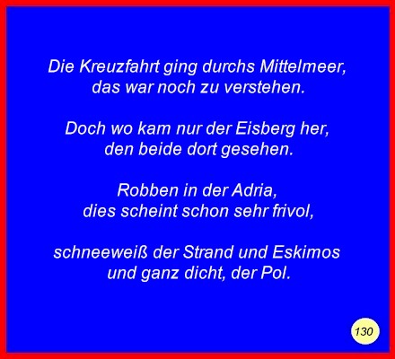 Text Die Kreuzfahrt ging durchs Mittelmeer,das war noch zu verstehen. Doch wo kam nur der Eisberg her, Robben in der Adria, schneeweiß der Strand und Eskimos C 2008 Buchstabe des Tages: s