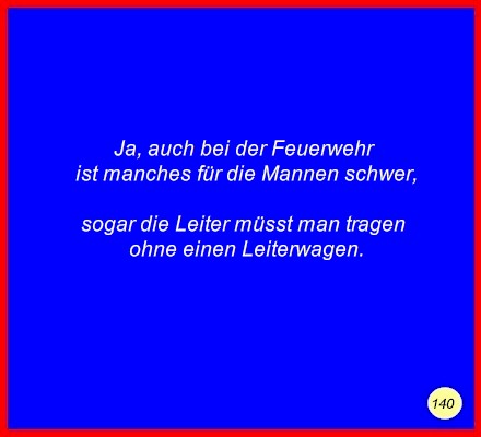 Text Ja, auch bei der Feuerwehrist manches für die Mannen schwer, sogar die Leiter müsst man tragen C 2008 Buchstabe des Tages: e