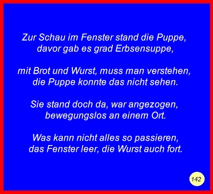Text Zur Schau im Fenster stand die Puppe,davor gab es grad Erbsensuppe, mit Brot und Wurst, muss man verstehen, Sie stand doch da, war angezogen, Was kann nicht alles so passieren, C 2008 Buchstabe des Tages: h