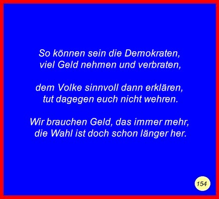 Text So können sein die Demokraten,viel Geld nehmen und verbraten, dem Volke sinnvoll dann erklären, Wir brauchen Geld, das immer mehr, C 2008 Buchstabe des Tages: i