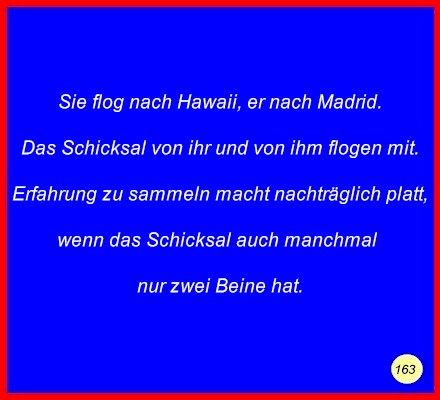 Text Sie flog nach Hawaii, er nach Madrid.Das Schicksal von ihr und von ihm flogen mit. Erfahrung zu sammeln macht nachträglich platt, wenn das Schicksal auch manchmal C 2008 Buchstabe des Tages: r