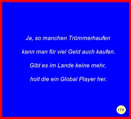 Text Ja, so manchen Trümmerhaufenkann man für viel Geld auch kaufen. Gibt es im Lande keine mehr, C 2008 Buchstabe des Tages: e