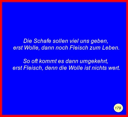 Text Die Schafe sollen viel uns geben,erst Wolle, dann noch Fleisch zum Leben. So oft kommt es dann umgekehrt, erst Fleisch,