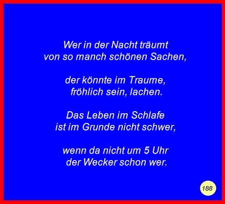 Text Wer in der Nacht träumtvon so manch schönen Sachen, der könnte im Traume, fröhlich sein, lachen. Das Leben im Schlafe ist im Grunde nicht schwer, wenn da nicht um 5 Uhr der Wecker schon wer.