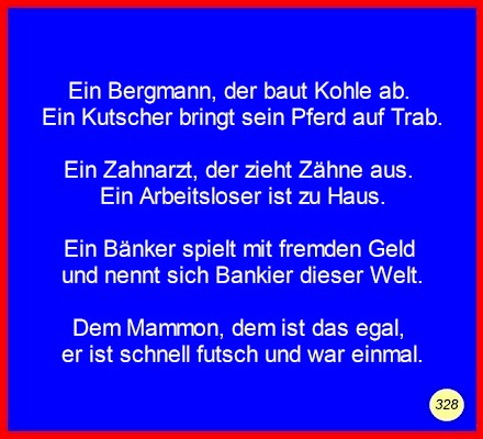 Text Ein Bergmann, der baut Kohle ab.Ein Kutscher bringt sein Pferd auf Trab. Ein Zahnarzt, der zieht Zähne aus. Ein Bänker spielt mit fremden Geld Dem Mammon, dem ist das egal, C 2008 Buchstabe des Tages: l