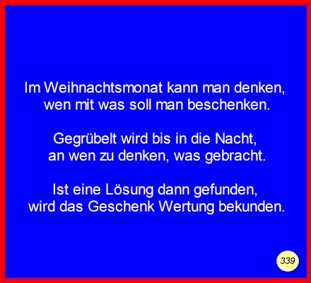 Text Im Weihnachtsmonat kann man denken,wen mit was soll man beschenken. Gegrübelt wird bis in die Nacht, Ist eine Lösung dann gefunden, C 2008 Buchstabe des Tages: a