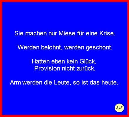 Text Sie machen nur Miese für eine Krise.Werden belohnt, werden geschont. Hatten eben kein Glück, Provision nicht zurück. Arm werden die Leute, so ist das heute.