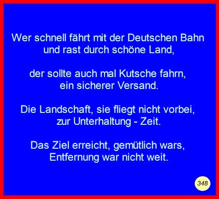 Text Wer schnell fährt mit der Deutschen Bahnund rast durch schöne Land, der sollte auch mal Kutsche fahrn, Die Landschaft, sie fliegt nicht vorbei, Das Ziel erreicht, gemütlich wars, C 2008 Buchstabe des Tages: r