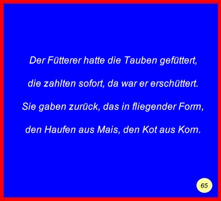 Text Der Fütterer hatte die Tauben gefüttert,die zahlten sofort, da war er erschüttert. Sie gaben zurück, das in fliegender Form, C 2008 Buchstabe des Tages: i
