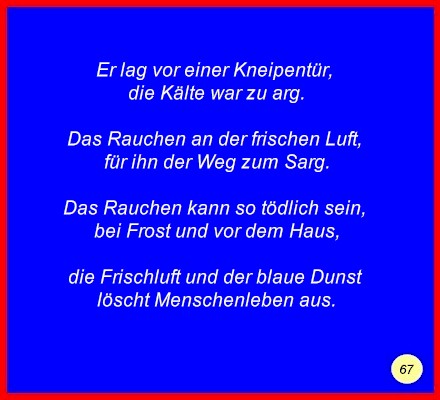 Text Er lag vor einer Kneipentür,die Kälte war zu arg. Das Rauchen an der frischen Luft, Das Rauchen kann so tödlich sein, die Frischluft und der blaue Dunst löscht