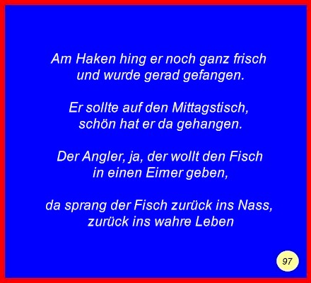 Text Am Haken hing er noch ganz frischund wurde gerad gefangen. Er sollte auf den Mittagstisch, Der Angler, ja, der wollt den Fisch da sprang der Fisch zurück ins Nass, C 2008 Buchstabe des Tages: r