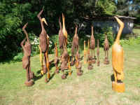 Die Kraniche aus Eiche oder Kiefer sind ab der Größe von zirka 40 cm erhältlich, auch Anstriche in verschiedenen Farben sind möglich.